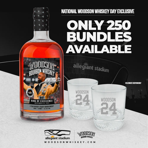 Limited Edition Allegiant Stadium “Circle of Excellence” Bottle paired with two “24 Woodson” heritage rocks glasses.